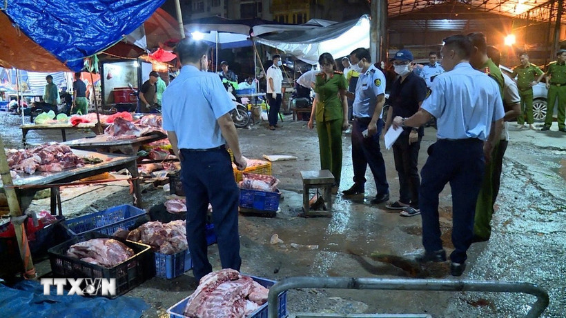 Lực lượng chức năng phát hiện và triệt phá đường dây giết mổ, tiêu thụ thịt lợn nhiễm bệnh ra thị trường. (Ảnh: TTXVN phát)