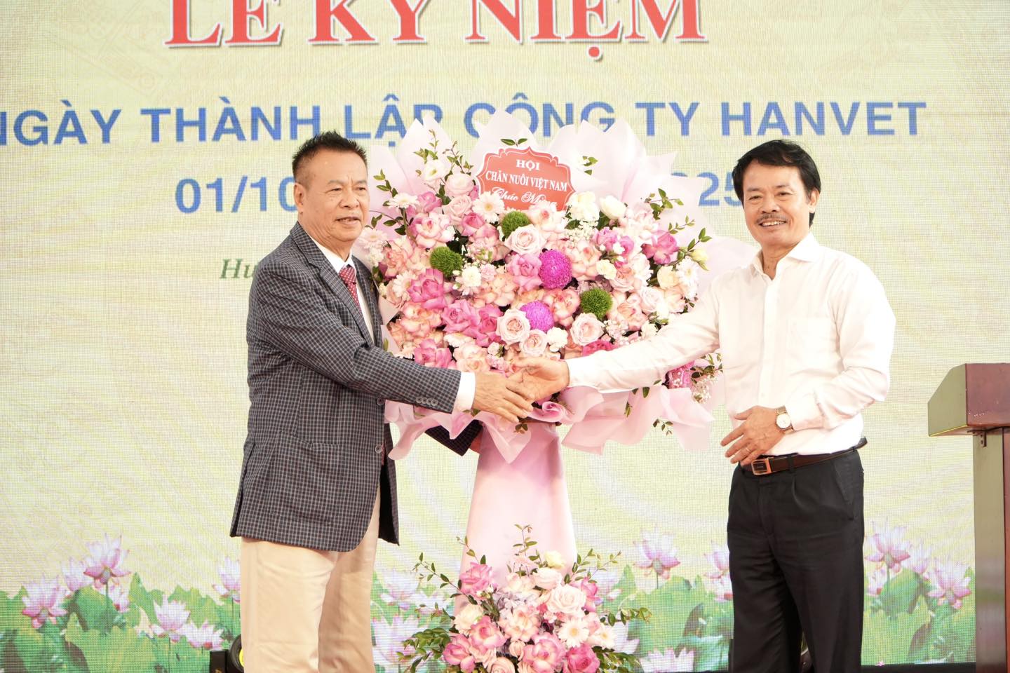 TS. Nguyễn Xuân Dương, Chủ tịch Hội Chăn nuôi Việt Nam tặng hoa chúc mừng công ty Hanvet