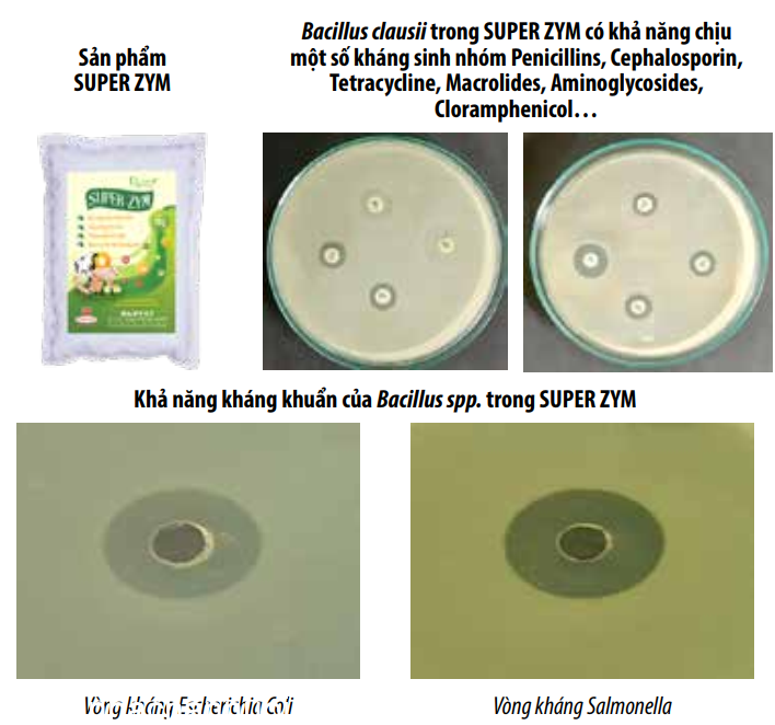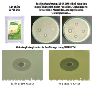 Sản phẩm SUPER ZYM của Công ty HANVET chứa các vi khuẩn sống có lợi dạng đậm đặc nhóm Bacillus (B. subtilis, B. clausii) hàm lượng ≥5×1010 CFU/kg; vi khuẩn Lactic (E. faecium, E. lactis) ≥5×1010 CFU/kg, kết hợp với các enzyme (Amylase, Protease, Xylanase, Mannanase, Phytase) và acid hữu cơ (Natri citrate, Canxi lactate) dùng bổ sung vào thức ăn cho gia súc, gia cầm để phòng trị bệnh đường ruột, nâng cao sức đề kháng, kích thích tiêu hóa, giảm hệ số tiêu tốn thức ăn, tăng năng suất, giảm ô nhiễm môi trường chăn nuôi. Sản phẩm có chứa men sống chịu kháng sinh, có thể dùng trong quá trình vật nuôi sử dụng kháng sinh.