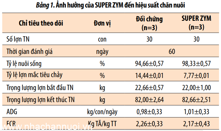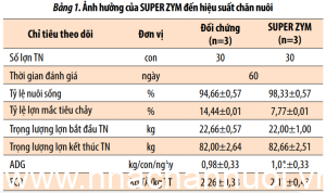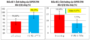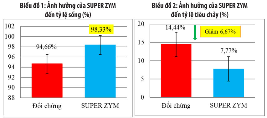 Bổ sung SUPER ZYM trong khẩu phần ăn hàng ngày làm giảm tỷ lệ tiêu chảy rõ rệt (giảm 6,67%) so với lô đối chứng và tăng tỷ lệ nuôi sống 3,67% khi không bổ sung.