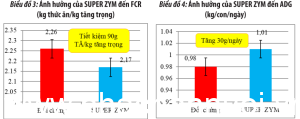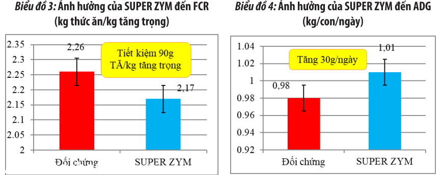 Ngoài ra, bổ sung SUPER ZYM làm giảm hệ số tiêu tốn thức ăn, tiết kiệm 0,09kg thức ăn cho mỗi kg tăng khối lượng; cải thiện hệ số tăng trọng trung bình hàng ngày 0,03 kg/ngày so với lô đối chứng không bổ sung.