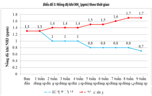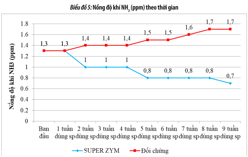 Việc bổ sung probiotic phức hợp vào chế độ ăn hàng ngày đã làm giảm rõ rệt nồng độ NH3. Sau 5 tuần sử dụng SUPER ZYM, nồng độ NH3 duy trì ổn định (0,8 ppm) trong khi lô đối chứng có nồng độ khí thải tăng dần. Điều này được lí giải là do lượng thức ăn tăng lên, đồng nghĩa lượng phân, khí thải ra nhiều hơn. Như vậy, sử dụng SUPER ZYM kiểm soát khí thải chuồng nuôi, giảm ô nhiễm môi trường chăn nuôi đáng kể.
