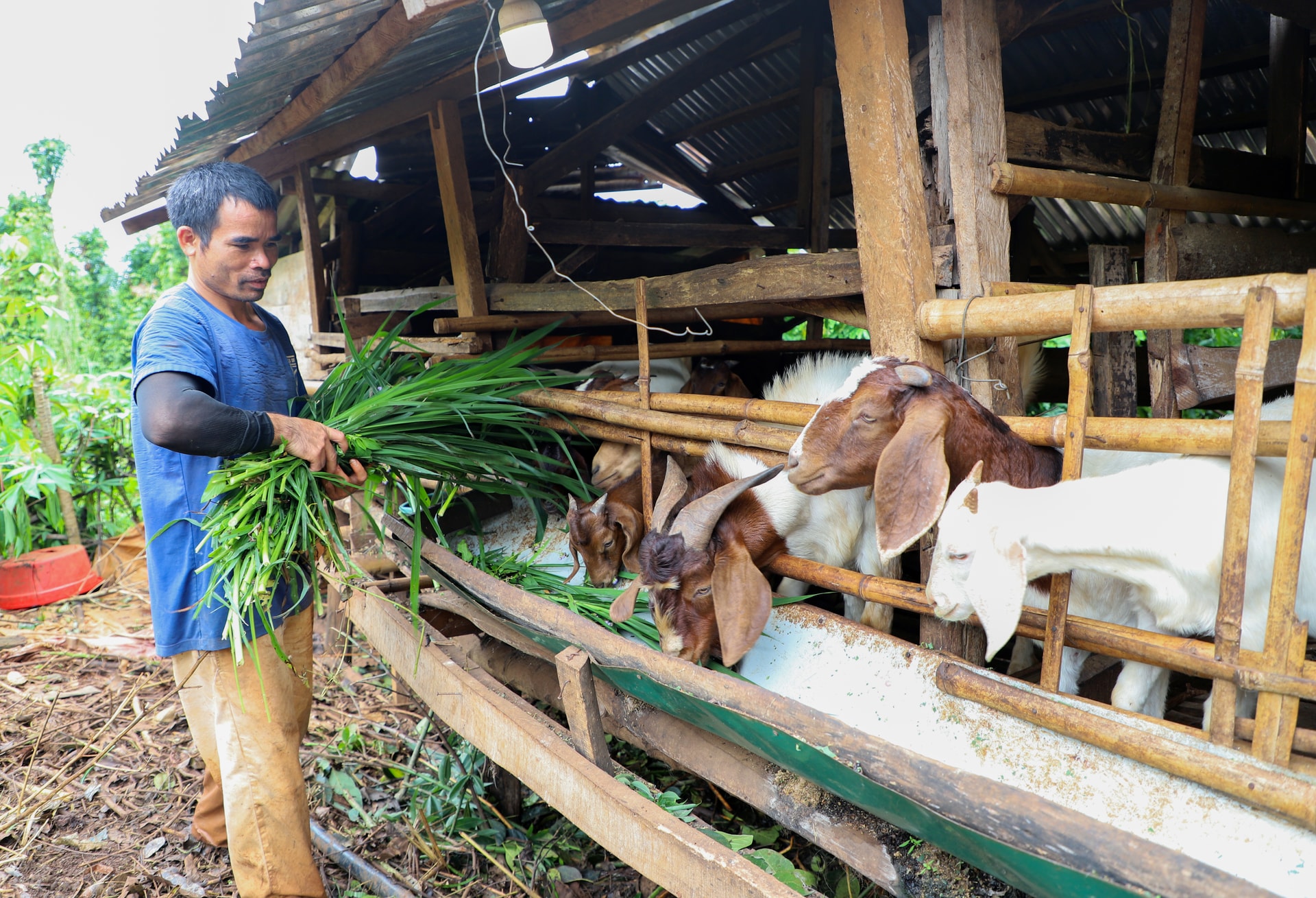 Gia đình anh Điểu Khoeng, dân tộc M’nông, bon N’Jang Bơ, xã Trường Xuân, tỉnh Lâm Đồng từng là hộ nghèo vì ít đất sản xuất, vốn ít, con đông, phải đi chăn bò thuê. Nhằm giúp anh có sinh kế bền vững, chính quyền địa phương đã hỗ trợ dê giống để anh phát triển chăn nuôi. Nhờ tận dụng nguồn cỏ tự nhiên sẵn có, kiên trì chăm sóc và nhân đàn, đến nay anh đã bán hơn 5 con, tạo nguồn thu đáng kể. Đàn dê của gia đình cũng duy trì ổn định từ 5 – 7 con.