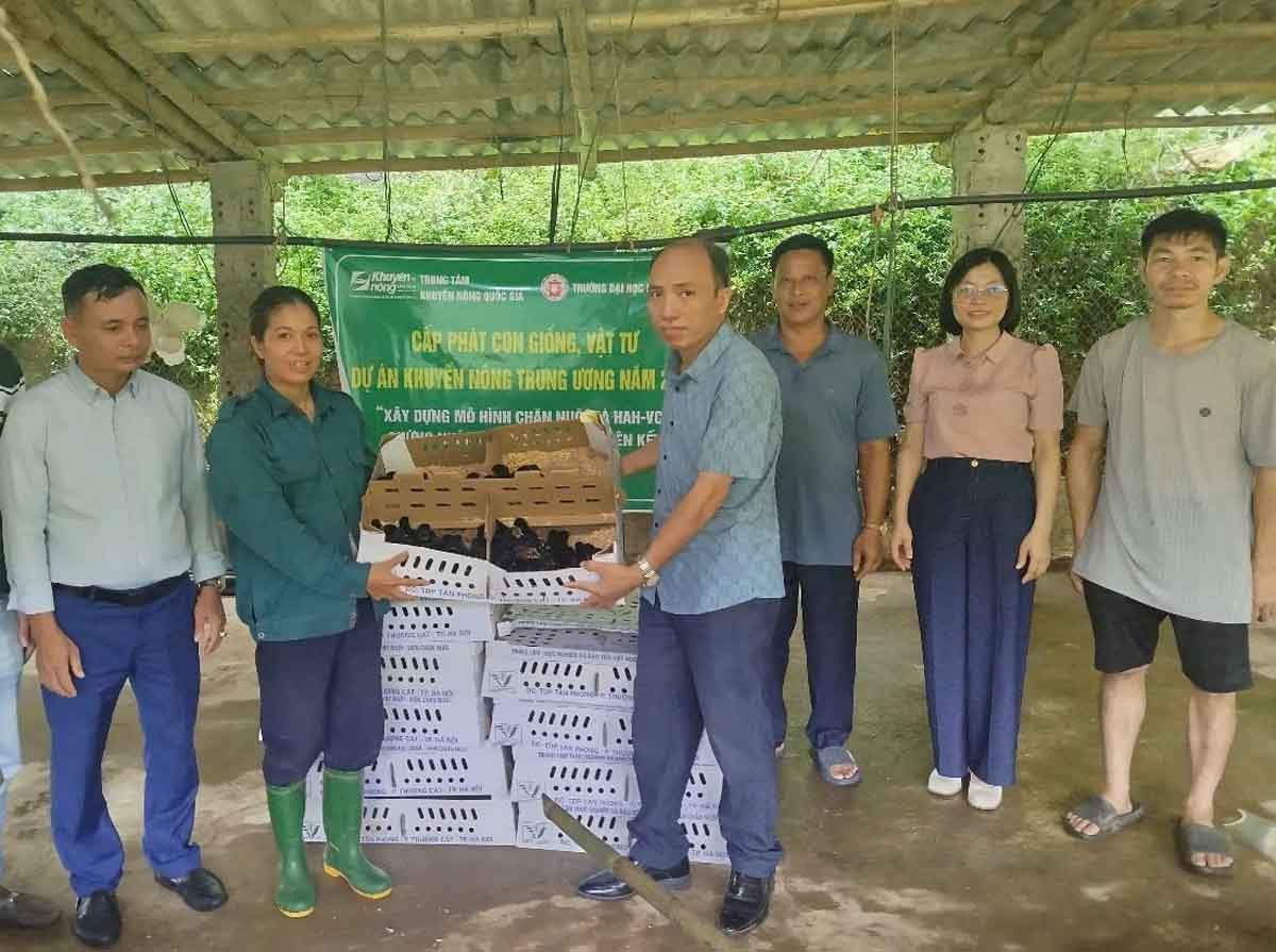 Trung tâm Khuyến nông và Dịch vụ nông nghiệp tỉnh Lào Cai vừa phối hợp với Trường Đại học Hùng Vương (Phú Thọ) – đơn vị chủ nhiệm dự án, cùng Phòng Kinh tế xã Trấn Yên triển khai cấp phát con giống và vật tư hỗ trợ cho các hộ dân tham gia mô hình chăn nuôi gà HAH-VCN theo hướng an toàn sinh học.