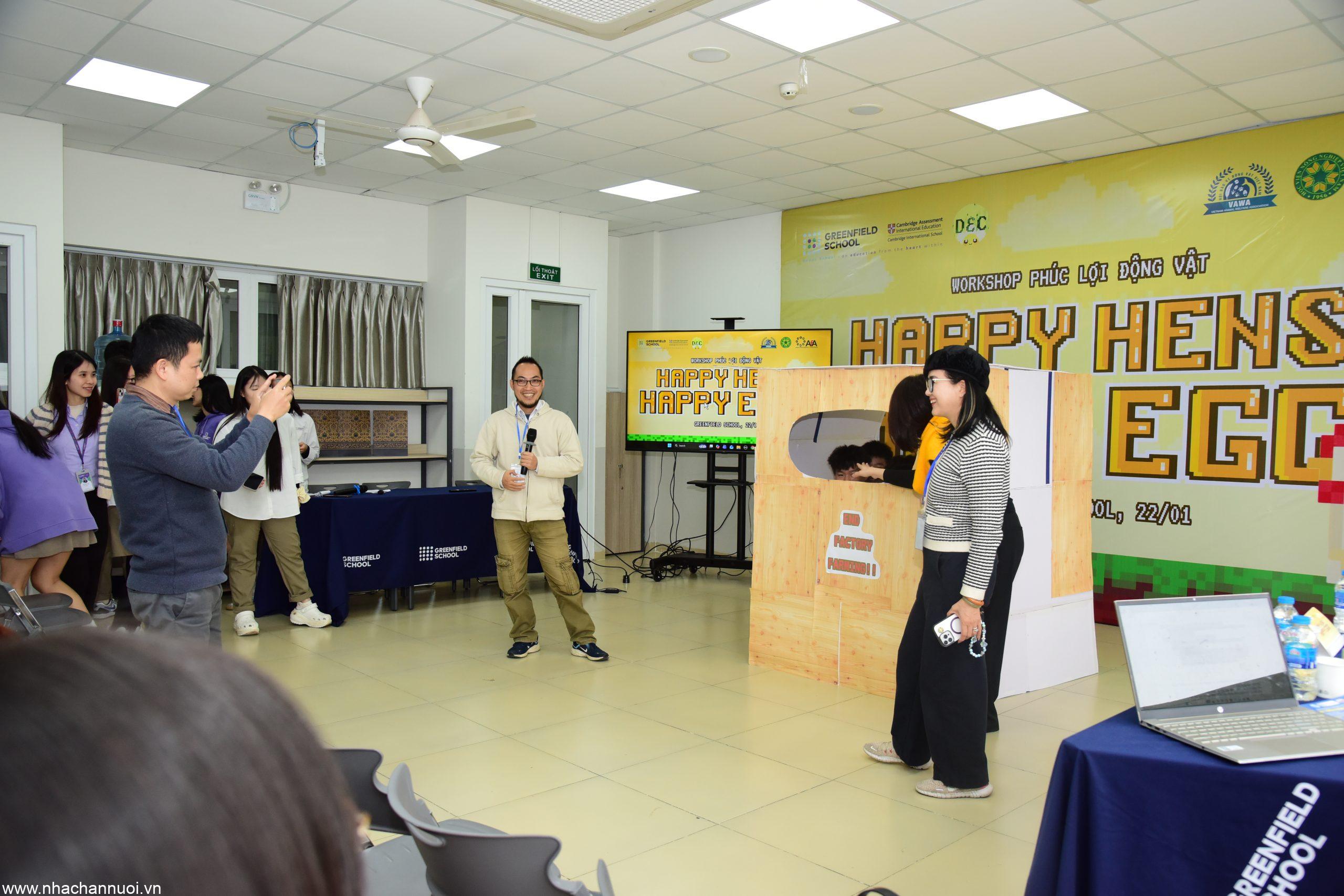 Tại buổi hội thảo, ông Nguyễn Tam Thanh, đại diện Liên minh Động vật Trang trại đã trực tiếp mời các em học sinh tham gia một hoạt động trải nghiệm đặc biệt, khi cùng bước vào một mô hình không gian khép kín nhằm mô phỏng điều kiện sống của những con gà bị nuôi nhốt trong chuồng chật hẹp, thiếu ánh sáng mặt trời và bị ép ăn quá mức, dẫn đến hệ xương yếu, dễ giòn. Chỉ với năm học sinh đứng trong mô hình, không gian đã trở nên chật chội, gây cảm giác mỏi chân, khó thở và ngột ngạt, giúp các em phần nào cảm nhận được sự tù túng mà đàn gà phải chịu đựng.