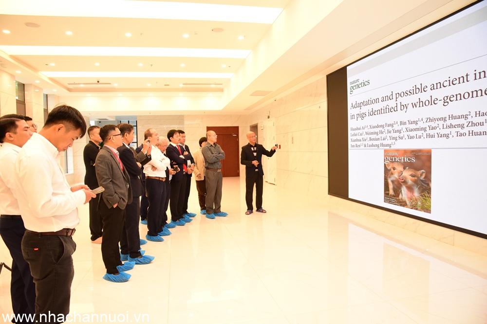 Tại đây, Đoàn được tham quan, nghe giới thiệu về phòng bảo quản lưu trữ Gen của các giống lợn trên Thế giới. Được giới thiệu khái quát công trình nghiên cứu chuyên sâu về di truyền chọn lọc các tính trạng nâng cao năng suất, chất lượng thịt và khả năng kháng bệnh của lợn, trong đó có tính trạng tăng số lượng xương sườn lợn và độ dài thân thịt.