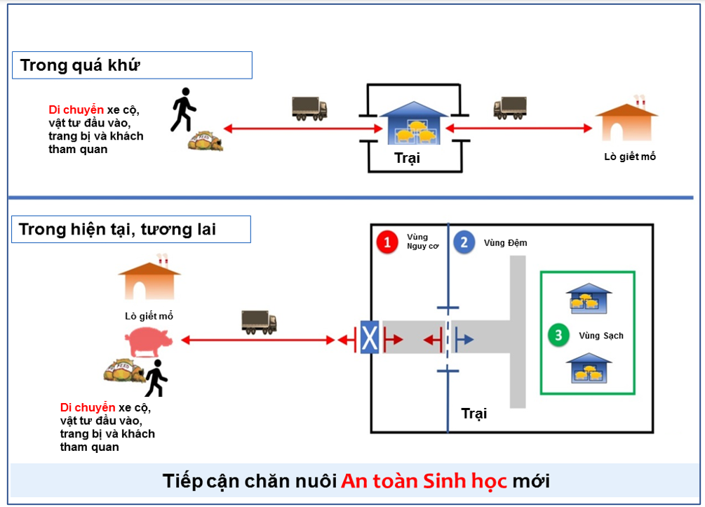 Ở “kỷ nguyên” dịch bệnh truyền nhiễm phức tạp, “chúng ta cần thiết thay đổi tự duy cũ sang tư duy mới trong chăn nuôi an toàn dịch bệnh”, tiếp cận an toàn sinh học mới. Trong tiếp cận an toàn sinh học mới, tất cả các yếu tố an toàn sinh học kể trên được xem xét, phân loại và sắp đặt vào không gian an toàn sinh học nhất định của trại (bên ngoài và bên trong). Để đạt được an toàn sinh học theo tiếp cận mới, cấu trúc (mô hình) trại cần được phân định ra thành 03 vùng an toàn sinh học khác nhau về mặt không gian (Hình 3), được đặt tên là vùng Nguy cơ, vùng Đệm và vùng Sạch; 3 vùng này ngăn cách nhau bởi các lớp hàng rào an toàn sinh học, hàng rào an toàn sinh học ngăn cách các vùng không chỉ là tường rào (phần cứng) mà còn là quy trình hoạt động của trại (phần mềm), được tái sắp xếp theo một trật tự mới. Các yếu tố nguy cơ cao từ bên ngoài sẽ được loại bỏ, ngăn chặn từ hàng rào bên ngoài hoặc chỉ cho nhập trại ở đúng vị trí nhất định (Vùng nguy cơ) và được xử lý nguy cơ triệt để. Phần lớn nguy cơ truyền nhiễm có nguồn gốc từ bên ngoài vào, nên đây là hàng rào an toàn sinh học cần được bảo vệ chặt chẽ và đầu tiên. Ở vùng nguy cơ, tất cả yếu tố nguy cơ nhập trại cần được áp dụng phân loại mức độ nguy cơ, loại bỏ hoặc xử lý triệt để sự vấy nhiễm và cần áp dụng “thời gian nghỉ tối thiểu cần thiết – empty time” để chấm dứt sự sống của mầm bệnh theo một cách tự nhiên theo thời gian; bên cạnh đó hạn chế sự tiếp xúc, nhiễm chéo và tồn lưu mầm bệnh trong các vùng của trại nuôi. Vùng Đệm là hàng rào an toàn sinh học bảo vệ thứ hai để đảm bảo các yếu tố nguy cơ được loại bỏ hoàn toàn mầm bệnh theo không gian và thời gian trước khi cho phép đi vào vùng Sạch. Vùng Sạch là vùng bảo vệ cuối cùng, có tính an toàn cao của trại chăn nuôi, tại đây hoạt động sinh trưởng và phát triển của heo được diễn ra hiệu quả.