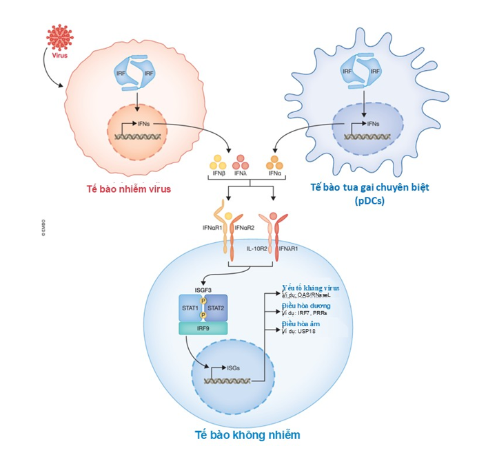 Virus xâm nhập kích hoạt IRFs trong tế bào cảm nhiễm và pDCs (plasmacytoid dendritic cell), dẫn đến tiết IFNα, IFNβ, IFNλ. Các IFNs tác động lên tế bào chưa nhiễm thông qua thụ thể IFNαR hoặc IL-10R2/IFNλR1, kích hoạt đường truyền tín hiệu JAK-STAT và hình thành phức hợp ISGF3 (STAT1, STAT2, IRF9). ISGF3 thúc đẩy phiên mã ISGs, tạo các chất hiệu quả kháng virus (antiviral effectors) (OAS, RNase L), yếu tố điều hòa dương (IRF7, PRRs), và yếu tố điều hòa âm (USP18), giúp thiết lập trạng thái kháng virus và hạn chế sự nhân lên của virus.