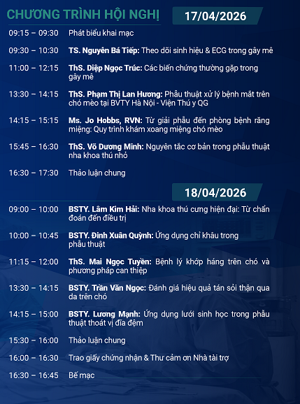 Với chủ đề “Phẫu thuật & Kiểm soát dấu hiệu sinh tồn: Từ lý thuyết đến thực hành”, hội nghị năm nay không chỉ dừng lại ở lý thuyết hàn lâm, mà còn tập trung giải quyết những thách thức hàng đầu mà các bác sĩ lâm sàng thường gặp: làm thế nào để theo dõi chính xác các dấu hiệu sinh tồn trong quá trình gây mê? Làm sao để xử lý kịp thời các biến chứng nguy hiểm? Phẫu thuật vùng mắt, nha khoa hay các bệnh lý phức tạp như thoát vị đĩa đệm, sỏi thận trên chó mèo cần những kỹ thuật nào để đạt hiệu quả cao nhất?