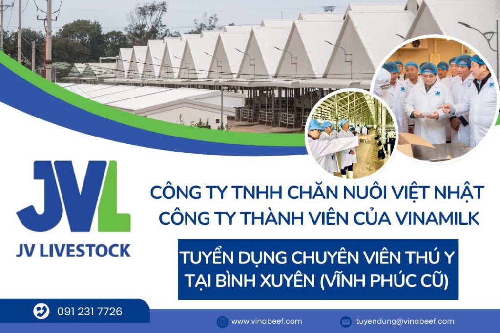JVL – Công ty TNHH Chăn nuôi Việt Nhật (Công ty thành viên Vinamilk) tuyển dụng nhân sự ngành Chăn nuôi – Thú y tại Bình Xuyên (Vĩnh Phúc cũ), với chế độ phúc lợi đầy đủ, thu nhập ổn định và môi trường làm việc chuyên nghiệp.