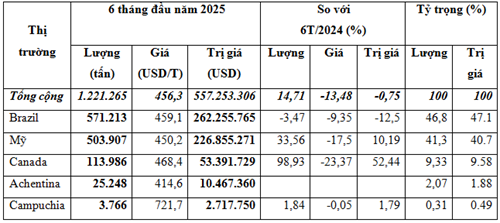 Brazil là thị trường lowsn nhất cung cấp đậu tương cho Việt Nam trong 6 tháng đầu năm 2025, chiếm 46,8% trong tổng lượng và chiếm 47,1% trong tổng kim ngạch nhập khẩu đậu tương của cả nước, đạt 571.213 tấn, tương đương trên 262,26 triệu USD, giá trung bình 459 USD/tấn, giảm 3,5% về lượng, giảm 12,5% về kim ngạch và giảm 9,4% về giá so với 6 tháng đầu năm 2024; riêng tháng 6/2025 đạt 207.987 tấn, tương đương 94,62 triệu USD, giá 454,9 USD/tấn, tăng 27,9% về lượng, tăng 19,5% kim ngạch so với tháng 5/2025 nhưng giá giảm 6,6%; so với tháng 6/2024 thì tăng rất mạnh 932% về lượng, tăng 901% kim ngạch nhưng giảm 3% về giá.