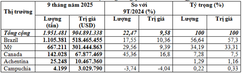 Brazil là thị trường lớn nhất cung cấp đậu tương cho Việt Nam trong 9 tháng đầu năm 2025, chiếm 56,6% trong tổng lượng và chiếm 57,3% trong tổng kim ngạch nhập khẩu đậu tương của cả nước, đạt 1,11 triệu tấn, tương đương gần 518,47 triệu USD, giá trung bình 469 USD/tấn, tăng 17,6% về lượng, tăng 10,4% về kim ngạch nhưng giảm 6,1% về giá so với 9 tháng năm 2024; riêng tháng 9/2025 đạt 70.054 tấn, tương đương 34,78 triệu USD, giá 496,5 USD/tấn, giảm 69,8% về lượng, giảm 68,6% kim ngạch nhưng giá tăng 3,9% so với tháng 8/2025; so với tháng 9/2024 cũng giảm 20,2% về lượng, giảm 14,3% kim ngạch nhưng tăng 7,3% về giá.
