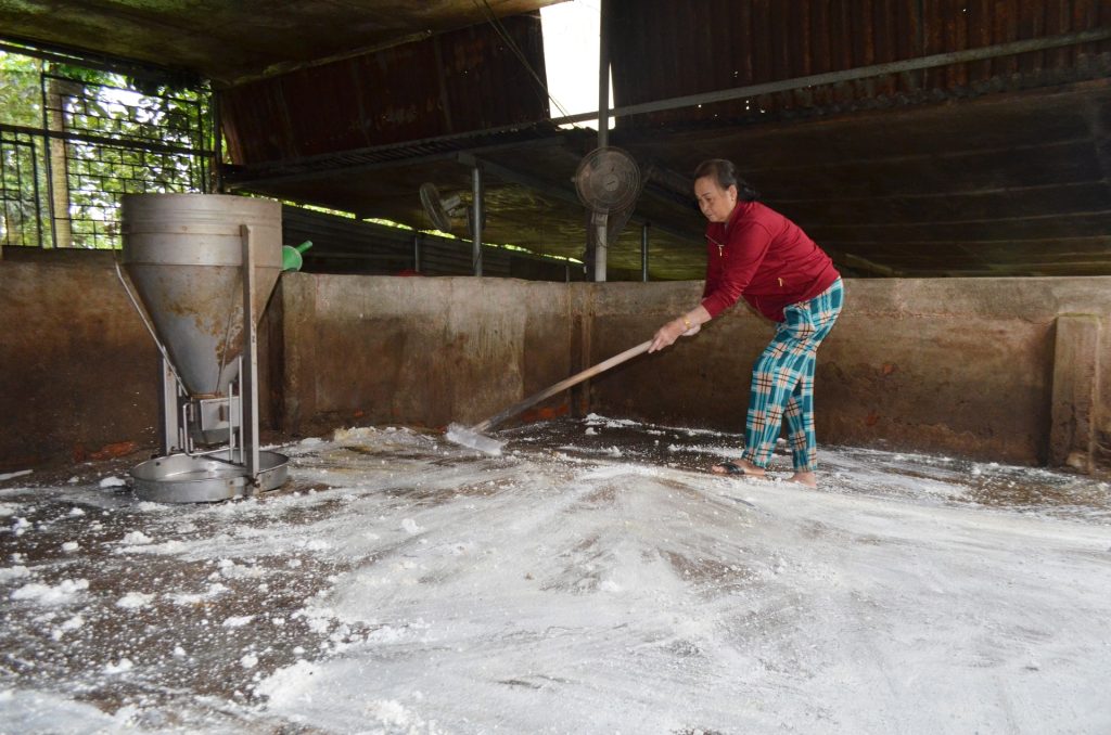 Bà Nguyễn Thị Tuyết, thôn 1, xã Nhân Cơ tích cực vệ sinh, khử độc môi trường chuồng nuôi chuẩn bị nuôi lứa mới sau dịch tả heo châu Phi. Ảnh: Báo Lâm Đồng