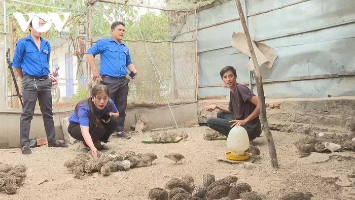 Đoàn viên, thanh niên đến thăm mô hình muôi chim cút thương phẩm của anh Nguyễn Thanh Đức. Ảnh: VOV