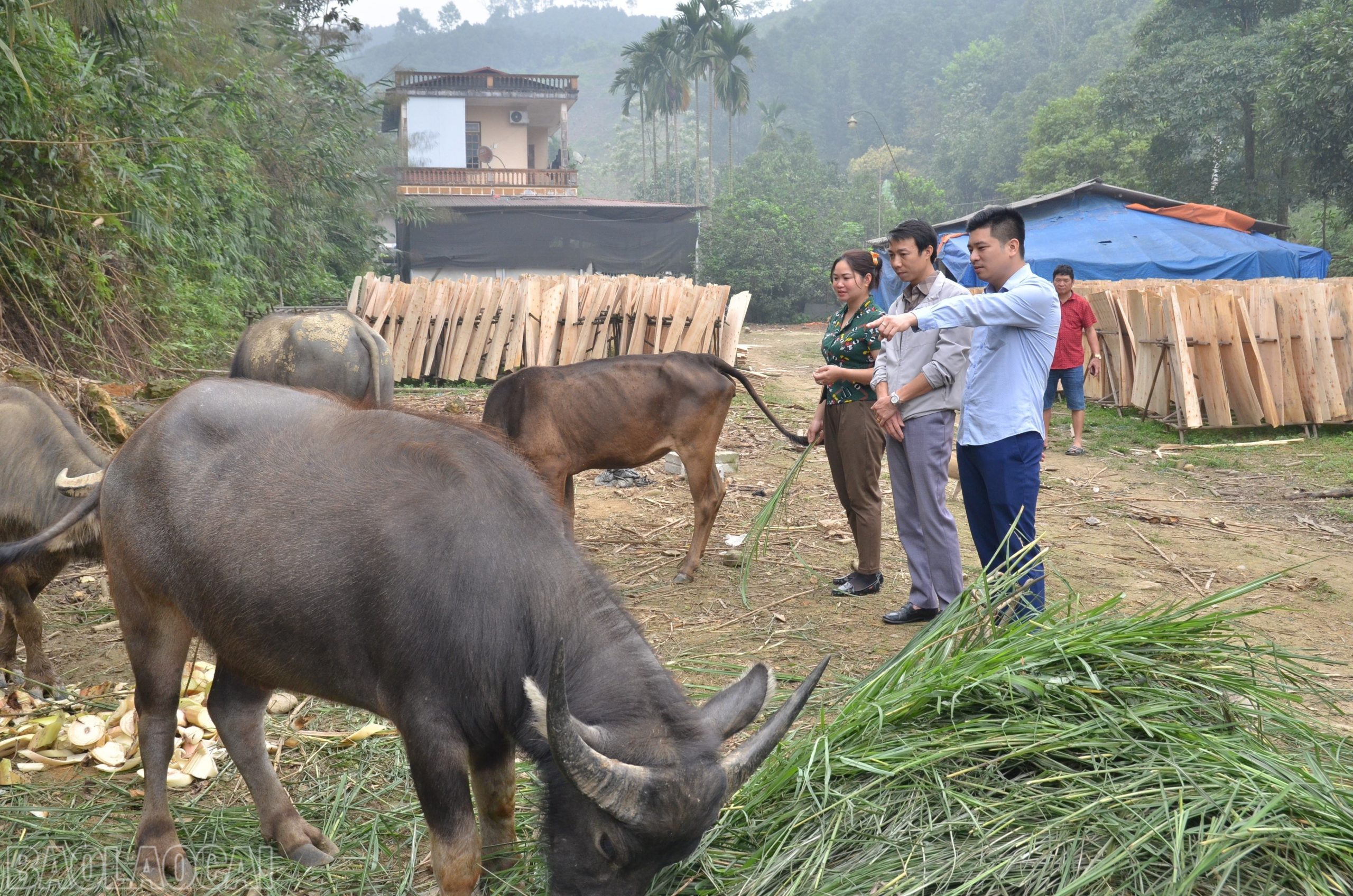 Cán bộ xã Lương Thịnh kiểm tra mô hình chăn nuôi trâu, bò tại thôn Vực Tròn.