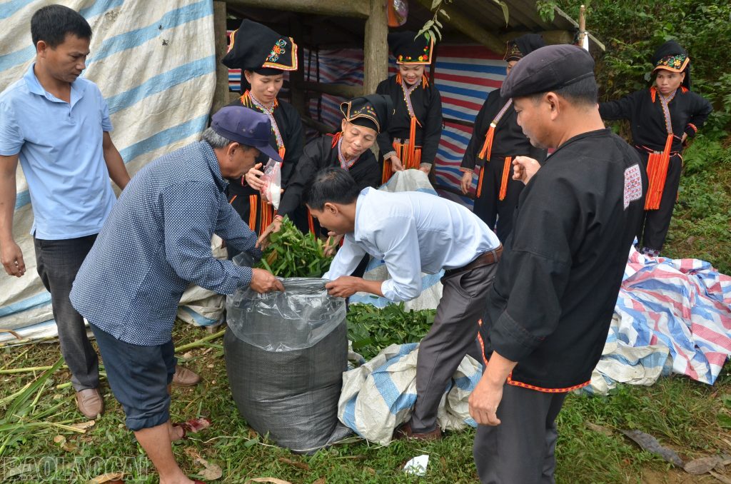 Cán bộ xã Xuân Ái và thú y viên cơ sở hướng dẫn người dân ủ chua thức ăn cho gia súc.