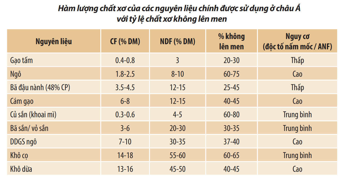 Việc đạt được các mục tiêu về chất xơ này với các nguyên liệu tiêu chuẩn là một thách thức. Các giá trị này thể hiện phạm vi trung bình thường được báo cáo trong các ấn phẩm và bảng dữ liệu thức ăn cho các nguyên liệu Châu Á; tuy nhiên, thành phần chất xơ thay đổi rất nhiều tùy theo nguồn gốc, quy trình chế biến và bảo quản, và luôn cần được xác nhận bằng phân tích phòng thí nghiệm các lô nguyên liệu thô cụ thể trước khi sử dụng trong công thức thức ăn.