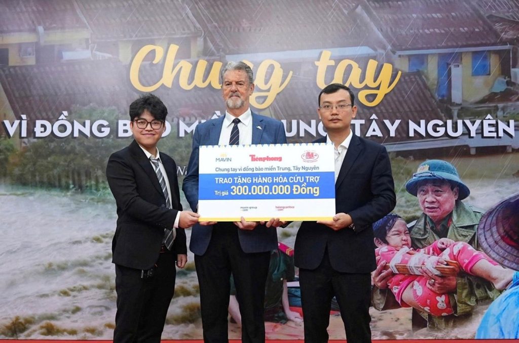 Ông David John Whitehead – Chủ tịch HĐQT Tập đoàn Mavin đã trực tiếp đến trụ sở Báo Tiền Phong (số 15 Hồ Xuân Hương, Hà Nội) trao bảng biểu trưng cứu trợ và chia sẻ: “Ban Lãnh đạo Tập đoàn Mavin đánh giá cao sáng kiến thực hiện chương trình “Chung tay vì đồng bào miền Trung, Tây Nguyên” của báo Tiền Phong và xúc động trước ý nghĩa cũng như sự lan tỏa của chương trình trong thời gian qua. Đó cũng là lý do chúng tôi lựa chọn đồng hành cùng Quý Báo và tin rằng, thông qua sự phối hợp này, những phần quà thiết thực từ Mavin và Hạ Long Canfoco sẽ đến tận tay những người dân thực sự cần giúp đỡ trong vùng mưa lũ”.