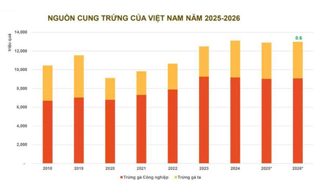Tuy nhiên, đà tái đàn mạnh từ cuối năm 2025 có thể dẫn tới dư cung cục bộ trong những tháng đầu năm 2026. Bên cạnh đó, biến động thời tiết ngày càng khó lường cũng gây áp lực lên khâu bảo quản trứng. Dự báo, quy mô sản xuất trứng trắng/hồng có thể tiếp tục thu hẹp trong năm 2026, nhường dư địa cho trứng nâu.