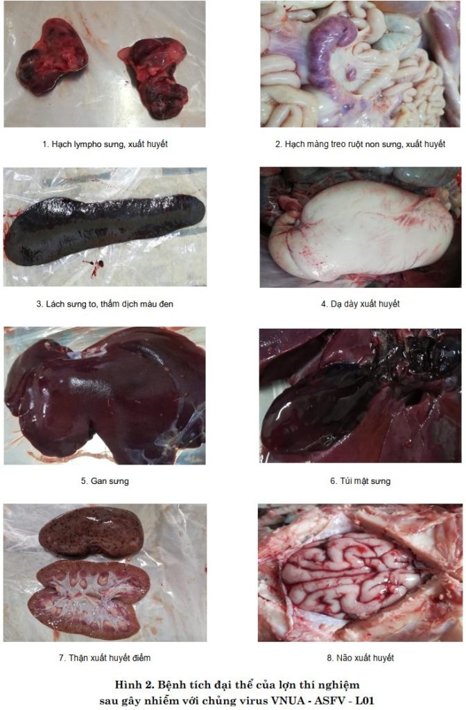 Tất cả bốn lợn thí nghiệm chết trong khoảng 7–9 ngày sau gây nhiễm, trong khi lợn đối chứng vẫn khỏe mạnh. Bệnh tích đại thể quan sát được khi mổ khám cho thấy các tổn thương điển hình như hạch lympho sưng đen và xuất huyết, lách sưng to thấm dịch màu đen, thận sưng và xuất huyết điểm, màng não và cơ tim xuất huyết, gan và túi mật sưng, cùng hiện tượng viêm tích dịch xoang ngực, xoang bụng và bao tim.