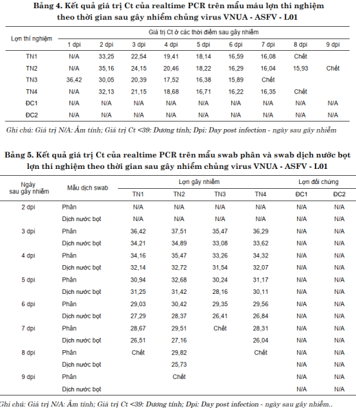 Kết quả Realtime PCR khẳng định virus đã có mặt trong máu từ ngày thứ 2 sau gây nhiễm và nhân lên mạnh từ ngày thứ 3 đến ngày thứ 6. Đồng thời, virus bắt đầu được thải ra môi trường qua dịch nước bọt và phân từ ngày thứ 3–5 và kéo dài liên tục cho đến khi lợn chết. Những kết quả này chứng tỏ chủng VNUA – ASFV – L01 có độc lực rất cao, gây bệnh thể cấp tính với tỷ lệ chết 100% trên lợn thí nghiệm.