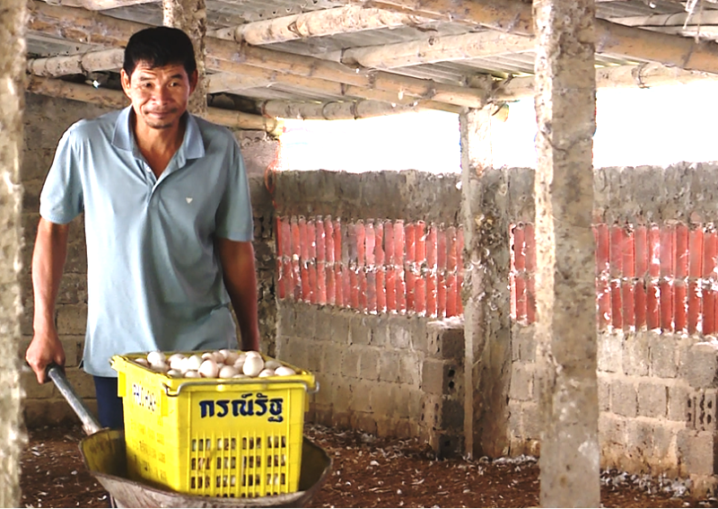 Trang trại nuôi vịt đẻ trứng của gia đình ông Nguyễn Viết Ngọc, xã Thọ Long được đầu tư xây dựng khép kín với quy mô hơn 2.000 con. Trung bình mỗi ngày ông Ngọc thu về khoảng 1.600 quả trứng. Ông Ngọc cho biết: “Với số lượng đàn vịt đẻ ăn từ 8- 9 bao cám mỗi ngày, giá gần 400 nghìn đồng/bao. Tổng chi phí thức ăn, điện nước, thuê nhân công thì 1 quả trứng phải hết 2.500 đồng. Tuy nhiên, từ sau Tết, giá trứng giảm dần, hiện tôi nhập cho các thương lái tại chỗ chỉ 2.200 đồng/quả, như vậy tôi đang lỗ khoảng 300 đồng 1 quả trứng”.