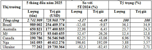 Brazil là thị trường lớn nhất cung cấp lúa mì cho Việt Nam trong 5 tháng đầu năm 2025, chiếm 36,1% trong tổng lượng và chiếm 34,9% trong tổng kim ngạch nhập khẩu lúa mì của cả nước, đạt 989.002 tấn, tương đương gần 254,41 triệu USD, giá trung bình 257,2 USD/tấn, giảm 12,5% về lượng, giảm 9,9% kim ngạch nhưng tăng 3% về giá so với 5 tháng đầu năm 2024; riêng tháng 5/2025 không nhập khẩu lúa mì từ thị trường này.