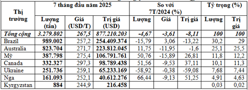 Brazil là thị trường lớn nhất cung cấp lúa mì cho Việt Nam trong 7 tháng đầu năm 2025, chiếm 30,2% trong tổng lượng và chiếm 29% trong tổng kim ngạch nhập khẩu lúa mì của cả nước, đạt 989.002 tấn, tương đương gần 254,41 triệu USD, giá trung bình 257,2 USD/tấn, giảm 15,8% về lượng, giảm 13,2% kim ngạch nhưng tăng 3,1% về giá so với 7 tháng đầu năm 2024; riêng tháng 7/2025 tiếp tục không nhập khẩu lúa mì từ thị trường này.