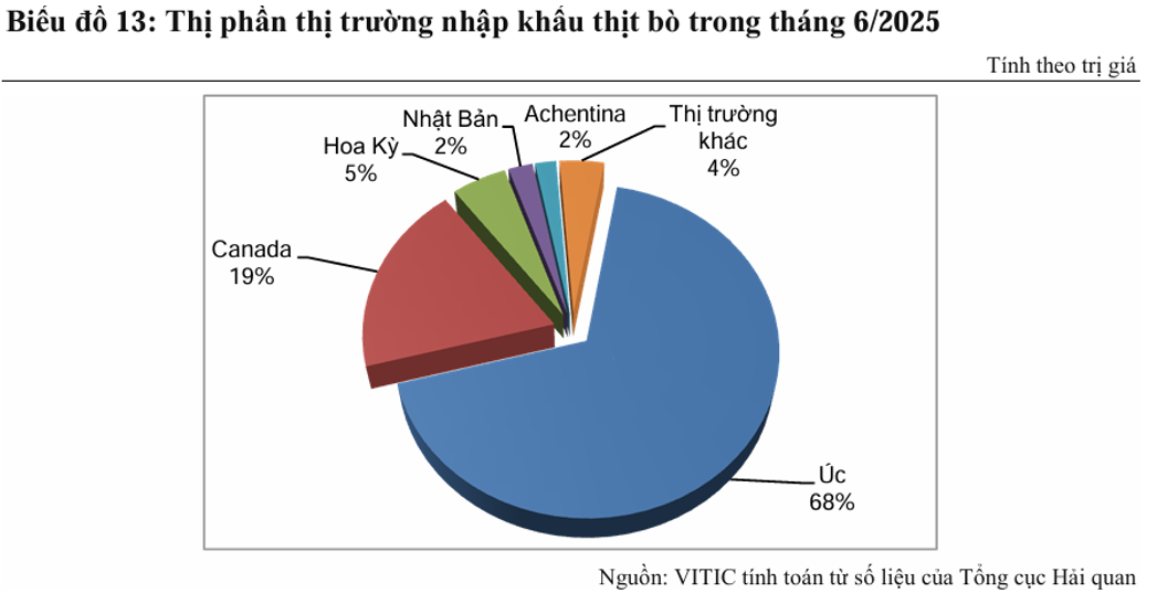 Trong tháng 6 năm 2025, Úc là thi ̣ trường cung cấp thi t bò lớn nhất của Việt Nam, vớ i lượng nhập khẩu đạt hơn 9,7 nghìn tấn và tri ̣ giá đạt hơn 29,2 triệu USD, tăng 0,1% về lượng và tăng 1,2% về trị giá so với tháng trước, chiếm 68,2% thị phần nhập khẩu của mặt hàng này; Lũy kế 6 tháng đầu năm 2025 đạt hơn 38 nghìn tấn, trị giá đạt hơn 122,1 triệu nghìn USD, giảm 12,1% về lượng và giảm 11% về trị giá so với cùng kỳ năm trước.