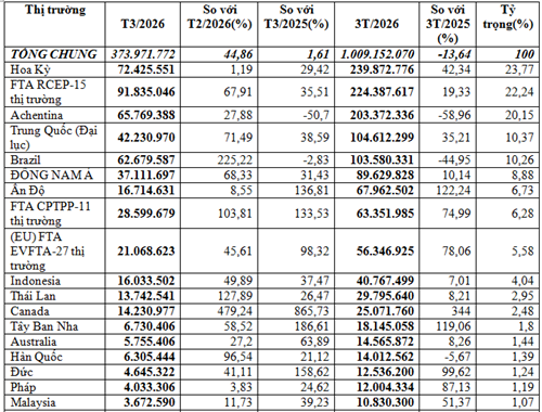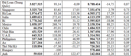 Đáng chú ý, một số thị trường tuy kim ngạch nhỏ, nhưng so với cùng kỳ năm 2025 lại tăng mạnh như: Ấn Độ tăng 122,24%, đạt 67,96 triệu USD, Italia tăng 203,57%, đạt 4,11 triệu USD và Tây Ban Nha tăng 119,06%, đạt 18,15 triệu USD.