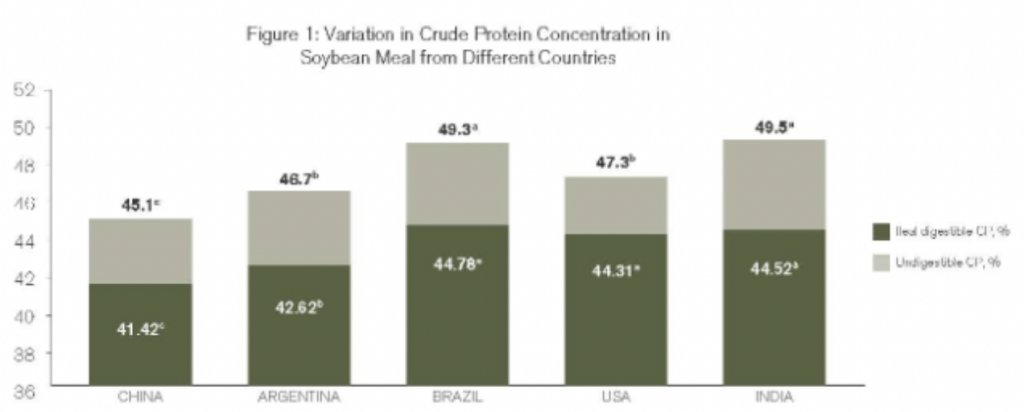 Nghiên cứu được thực hiện bởi Đại học Illinois (Lagos và Stein, 2017) đã so sánh hàm lượng và tỷ lệ tiêu hóa protein trong SBM, từ 5 quốc gia sản xuất SBM lớn nhất (Hình 1 và 2). Kết quả cho thấy tỷ lệ tiêu hóa của protein thô và AA thay đổi đáng kể tùy thuộc vào nguồn gốc SBM. Ví dụ, hàm lượng protein và axit amin cao nhất được tìm thấy trong các mẫu SBM từ Brazil và Ấn Độ. Tuy nhiên, tỷ lệ tiêu hóa của các mẫu SBM này lại thấp hơn, có nghĩa là chúng có lượng protein không tiêu hóa được nhiều nhất. Khoảng 9% hàm lượng protein thô trong các mẫu SBM của Brazil được phát hiện là không tiêu hóa được và khoảng 10% hàm lượng protein thô trong các mẫu SBM của Ấn Độ là không tiêu hóa được. Đây là một mối quan tâm lớn đối với các chuyên gia dinh dưỡng vì các protein không tiêu hóa có thể trở thành chất nền cho sự sinh sôi của vi khuẩn gây bệnh, làm tổn thương đến sức khỏe đường ruột và hiệu suất tăng trưởng. Ngoài ra, việc này còn làm tăng nguy cơ khẩu phần thực tế có hàm lượng protein khả dụng thấp hơn dự kiến, có thể tác dụng tiêu cực đến năng suất của vật nuôi. Ngoài ra, tỷ lệ tiêu hóa cao nhất được tìm thấy trong các mẫu SBM từ Hoa Kỳ. Chỉ sáu phần trăm hàm lượng protein thô trong các mẫu SBM của Hoa Kỳ bị tiêu hóa được.