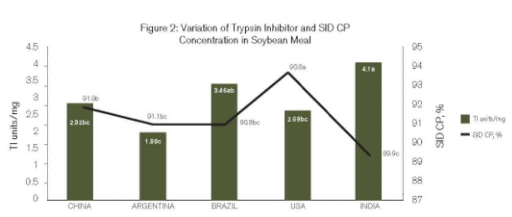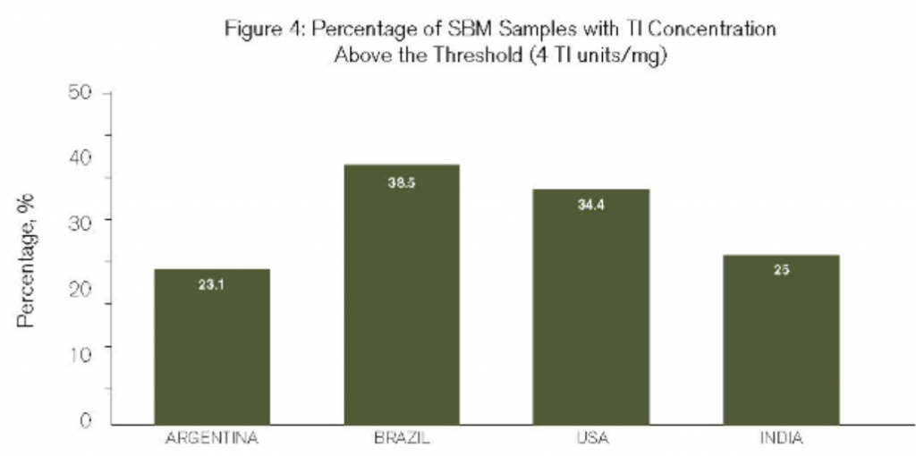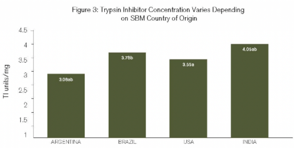 Nghiên cứu gần đây của Novus International cũng chứng minh rằng SBM từ các quốc gia khác nhau có nồng độ chất ức chế trypsin thay đổi. Thống nhất với nghiên cứu của Đại học Illinois, nghiên cứu của Novus đã phát hiện ra rằng các mẫu SBM từ Brazil và Ấn Độ có nồng độ chất ức chế trypsin cao nhất. Cả hai nghiên cứu đều phát hiện ra rằng chất ức chế trypsin trong các mẫu SBM từ Ấn Độ đều trên 4 u/mg một chút.