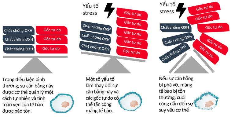 Hình 1. Khi lượng gốc tự do vượt quá khả năng trung hòa của hệ thống chống oxy hóa của cơ thể, dẫn đến stress oxy hóa