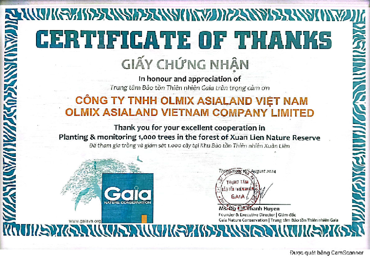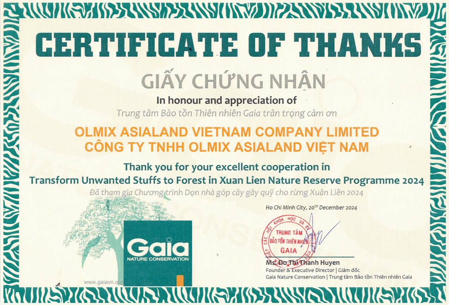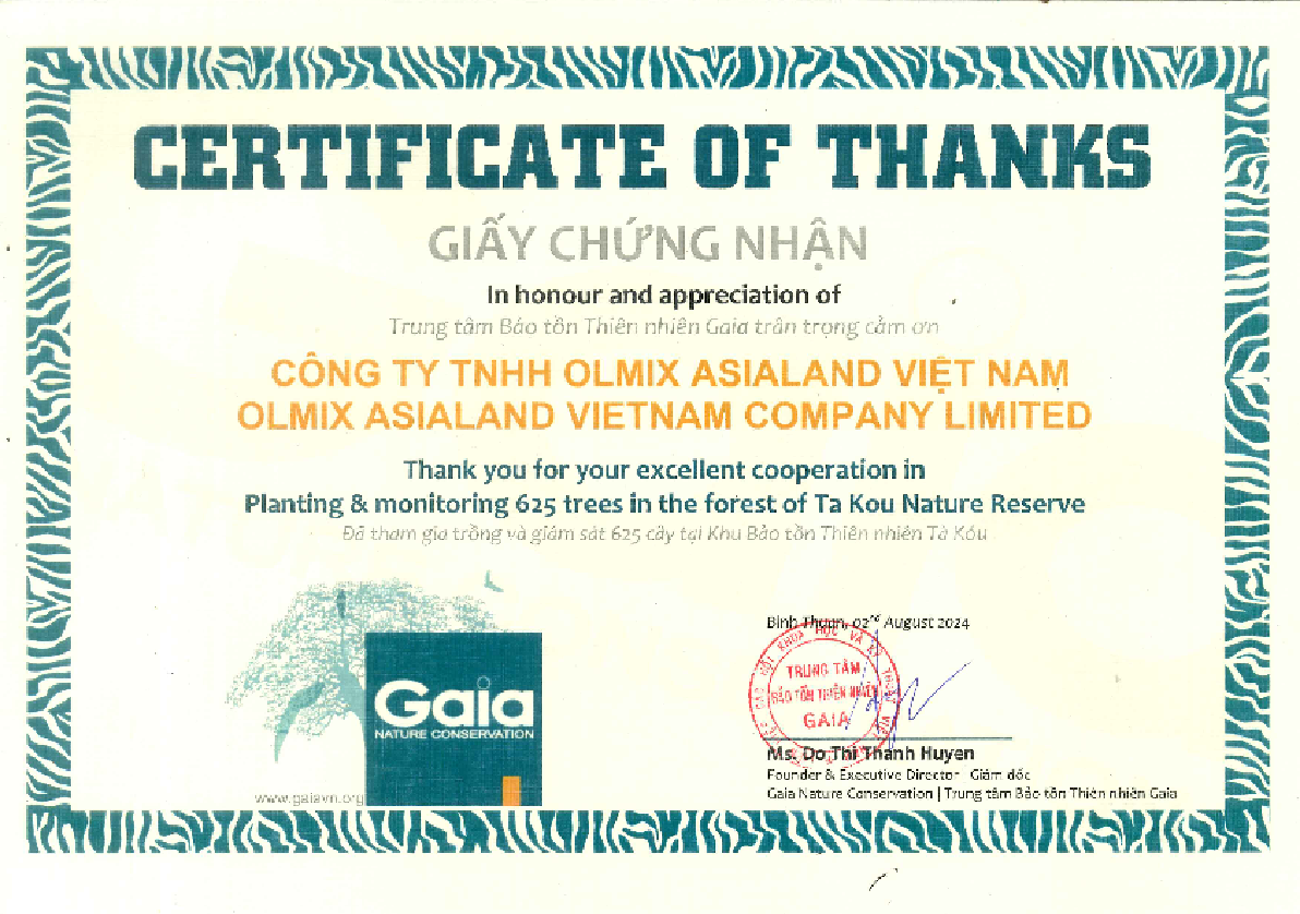 Ngày 02/08/2024 và 19/08/2024, đội ngũ Olmix Asialand Việt Nam đã cùng khách hàng tham gia trồng rừng tại Khu Bảo tồn Thiên nhiên Tà Cú (Bình Thuận) và Xuân Liên (Thanh Hóa). Đây là hoạt động nằm trong cam kết tài trợ trồng và chăm sóc 1.500 cây xanh trong 4 năm tại các rừng đặc dụng, rừng phòng hộ đầu nguồn. Bên cạnh đó, năm 2025 Olmix Asialand tiếp tục kết hợp với khách hàng trồng 1.000 cây tại rừng phòng hộ Dầu Tiếng tỉnh Tây Ninh.