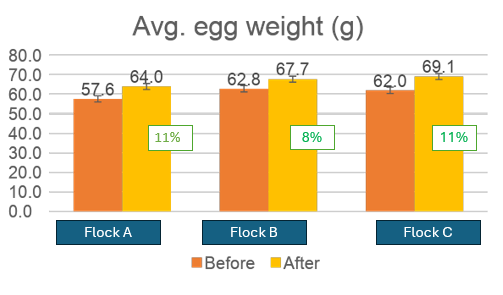 Cơ chế tác động của Phytocee được củng cố bởi các kết quả thử nghiệm thương mại, cho thấy sự cải thiện rõ rệt về trọng lượng trứng, hiệu quả sử dụng dinh dưỡng, tỷ lệ đẻ, chất lượng vỏ và độ tươi trứng. Những dữ liệu nhất quán này là minh chứng cho khả năng của sản phẩm trong việc hỗ trợ đàn gà phát huy hiệu suất tối ưu, ngay cả khi đối mặt với stress. Việc bổ sung Phytocee đã thể hiện các lợi ích rõ rệt: