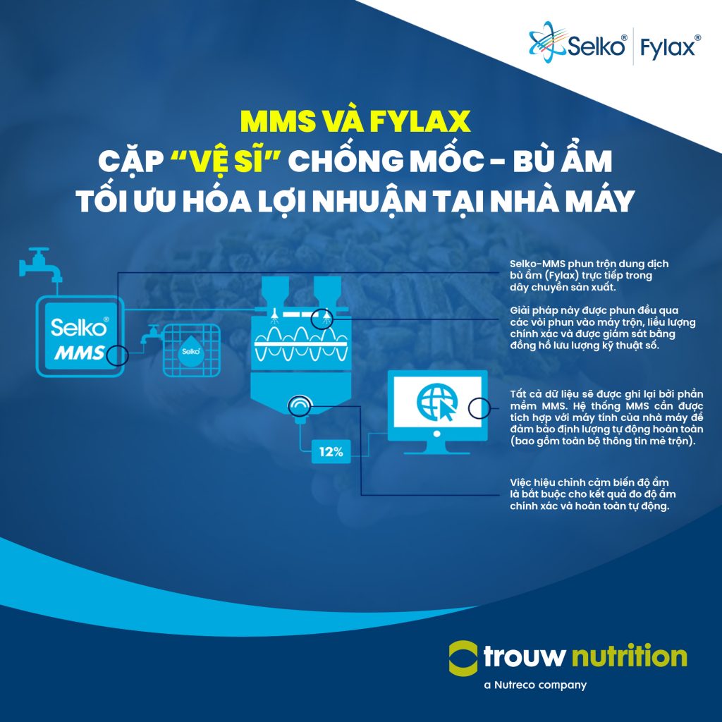 Bộ giải pháp Hệ thống phun định lượng Selko MMS & Fylax Forte HC-Liquid của Trouw Nutrition mang đến cách tiếp cận chủ động và toàn diện trong kiểm soát độ ẩm, phòng ngừa nấm mốc và tối ưu hóa lợi nhuận ngay từ khâu sản xuất. Trong bối cảnh nguyên liệu đầu vào và điều kiện khí hậu luôn biến động, độ ẩm chính là yếu tố then chốt ảnh hưởng trực tiếp đến chất lượng viên cám, rủi ro mốc – độc tố và chi phí vận hành của nhà máy.