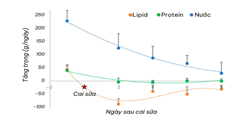Khi cai sữa, do lượng ăn giảm nhiều so với nhu cầu và stress gây tiêu hao nhiều năng lượng. Điều này làm cân bằng năng lượng âm, heo con ưu tiên duy trì mô nạc (protein) của cơ thể, tích nước giảm dần nhưng giảm tích trữ mô mỡ trong suốt tuần đầu tiên sau khi cai sữa (Van Kempen et al., 2023).