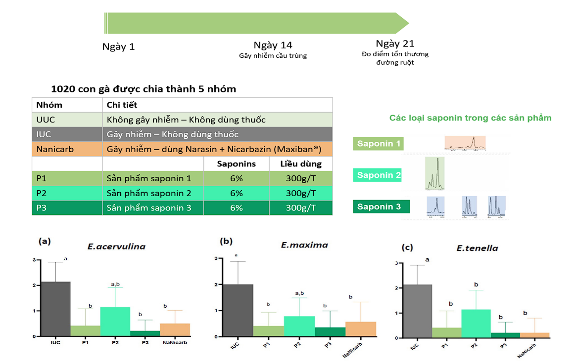 Kết quả cho thấy, rằng dù cùng hàm lượng saponin (6%) nhưng sản phẩm Saponin 3 có hiệu quả cao nhất trong việc kiểm soát các chủng cầu trùng E. acervulina, E. maxima, E. tenella so với 2 sản phẩm chứa saponin còn lại và kể cả so với thuốc chống cầu trùng. Sản phẩm Saponin 1 có hiệu quả hơn sản phẩm Saponin 2.