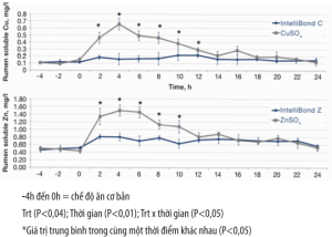 Hình 1: Ảnh hưởng của nguồn kim loại (Hydroxyl và SO4) đến độ hòa tan trong đường tiêu hóa trên*– thí nghiệm tại dạ cỏ