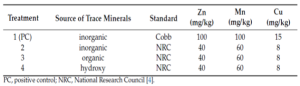 Bảng 1. Ảnh hưởng của các nguồn Zn, Mn và Cu khác nhau đến hiệu suất chăn nuôi gà thịt