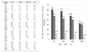 Kẽm, mangan và đồng trong gà thịt lúc 35 ngày tuổi với các mức bổ sung khác nhau trong khẩu phần. PC: đối chứng dương; ITM: khoáng vi lượng vô cơ; OTM: khoáng vi lượng hữu cơ; HTM: khoáng vi lượng hydroxy; các giá trị có ký tự mũ khác nhau giữa các nghiệm thức là khác biệt có ý nghĩa thống kê tại p < 0,05. n = 24.