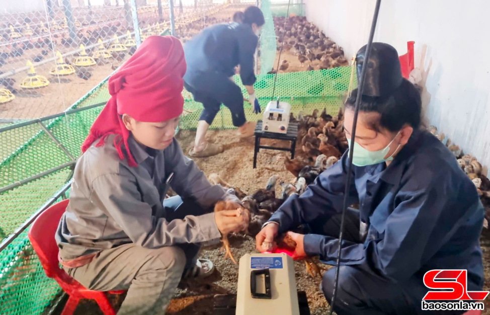 Công nhân tại trang trại chăn nuôi gà tại bản Pát, phường Chiềng Sinh, tiêm phòng cho đàn gia cầm.