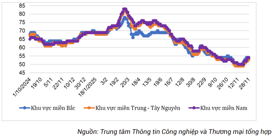 Giá lợn hơi tại khu vực miền Trung và Tây Nguyên dao động trong khoảng 49.000 – 53.000 đồng/kg, trong những ngày đầu tháng 11/2025, giá lợn hơi giảm từ 3.000 – 5.000 đồng/kg, đến giữa tháng giảm 4.000 đồng/kg, sau đó giảm 1.000 – 3.000 đồng/kg và sau đó ổn định.