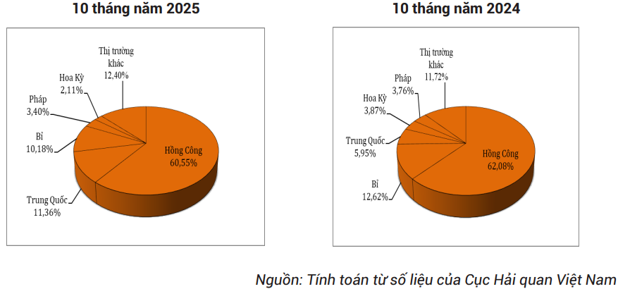 Trong 10 tháng năm 2025, Việt Nam xuất khẩu thịt và các sản phẩm thịt tới 33 thị trường. Trong đó, Hồng Kông vẫn là thị trường xuất khẩu thịt và các sản phẩm thịt lớn nhất của Việt Nam, chiếm 44,94% về lượng và 60,55% về trị giá trong tổng xuất khẩu thịt và các sản phẩm thịt của cả nước, đạt 8,4 nghìn tấn, trị giá 58,4 triệu USD, giảm 2,3% về lượng nhưng tăng 12,3% về trị giá so với cùng kỳ năm 2024. Trong đó, thịt và các sản phẩm thịt của Việt Nam được xuất khẩu sang thị trường Hồng Kông chủ yếu vẫn là thịt lợn sữa nguyên con đông lạnh và thịt lợn nguyên con đông lạnh.