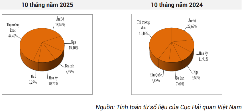 Trong đó, Ấn Độ vẫn là thị trường cung cấp thịt và các sản phẩm từ thịt lớn nhất cho Việt Nam trong 10 tháng năm 2025, chiếm 18,52% trong tổng lượng thịt và các sản phẩm từ thịt nhập khẩu của cả nước, với lượng đạt 150,2 nghìn tấn, trị giá 535,52 triệu USD, giảm 5,8% về lượng, tăng 0,8% về trị giá so với cùng kỳ năm 2024.