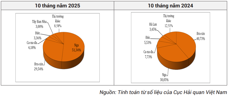 Nhập khẩu thịt lợn tươi ướp lạnh hoặc đông lạnh của Việt Nam trong 10 tháng năm 2025 đạt 159,4 nghìn tấn, trị giá 358,26 triệu USD, tăng 95,7% về lượng, tăng 90,8% về trị giá so với cùng kỳ năm 2024; giá nhập khẩu trung bình ở mức 2.240 USD/tấn, giảm 2,7% so với 10 tháng năm 2024. Việt Nam nhập khẩu thịt lợn từ 25 thị trường, trong đó Nga tiếp tục là thị trường lớn nhất, chiếm 51,34% tổng lượng thịt lợn nhập khẩu của cả nước; Brasil chiếm 29,54%; Canada chiếm 4,18%; Đức chiếm 3,36%; Tây Ban Nha chiếm 3%; Hà Lan chiếm 2,27%; các thị trường khác chiếm 6,32%.