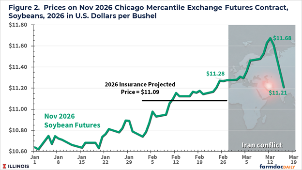 Giá hợp ngô và đậu tương kỳ hạn là những chỉ báo tốt về mức giá dự kiến vào thời điểm thu hoạch. Giá cả ngô và đậu tương đều tăng kể từ ngày 27/2, sau đó giảm mạnh vào ngày 16/3. Giá ngô kỳ hạn tháng 12/2026 trên Sàn giao dịch hàng hóa Chicago hôm 27/2/2026 là 4,69 USD. Kể từ ngày 27/2, giá ngô nhìn chung có xu hướng tăng, đạt 4,90 USD vào ngày 13/3, tăng 0,31 USD so với giá ngày 26/2.
