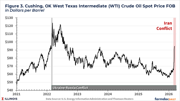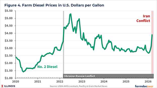 Những đợt giá dầu thô tăng gần đây tác động đến người nông sân. Trong báo cáo ngày 6 tháng 3 về Chi phí Sản xuất tại Illinois (Mỹ), Cơ quan Dịch vụ Tiếp thị Nông nghiệp (Agricultural Marketing Service) báo cáo giá nhiên liệu diesel ở mức 3,90 USD/gallon, tăng 0,76 USD so với mức trước đó là 3,14 USD/bushel. Nếu giá dầu thô tiếp tục tăng, giá nhiên liệu diesel có thể vượt quá 4,50 USD/gallon.