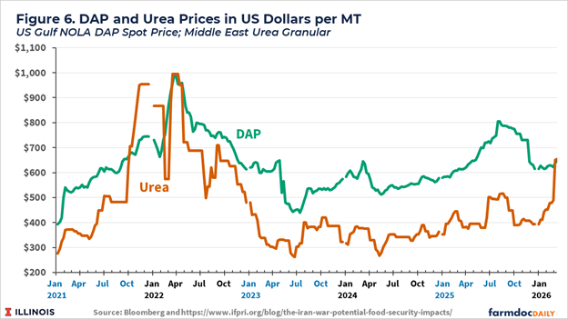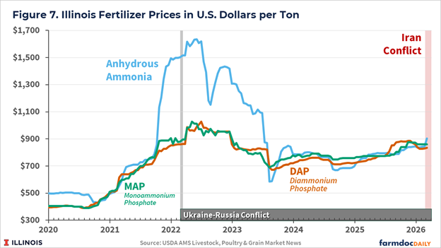 Hầu hết nông dân đã ký hợp đồng mua bán từ trước hoặc đã bón phần lớn phân bón nitơ cho vụ mùa năm 2026. Những người chưa mua tất cả phân bón nitơ sẽ phải đối mặt với chi phí cao hơn. Vì rất khó để ổn định giá mua bán nitơ vào thời điểm này. Thực vậy, AMS đã báo cáo giá bán amoniac khan ở mức hơn 900 USD/tấn. Nông dân trong tình huống này có thể quyết định chuyển một phần diện tích từ ngô sang đậu tương, vì đậu tương không cần nitơ. Thời vụ gieo trồng sắp tới rất gần, hầu hết các yếu tố đầu vào đã được chuẩn bị sẵn, và những thay đổi lớn trong kế hoạch gieo trồng dường như khó xảy ra. Tuy nhiên, một số diện tích đất có thể chuyển đổi, hướng chuyển đổi khả dĩ nhất là từ ngô sang đậu tương.