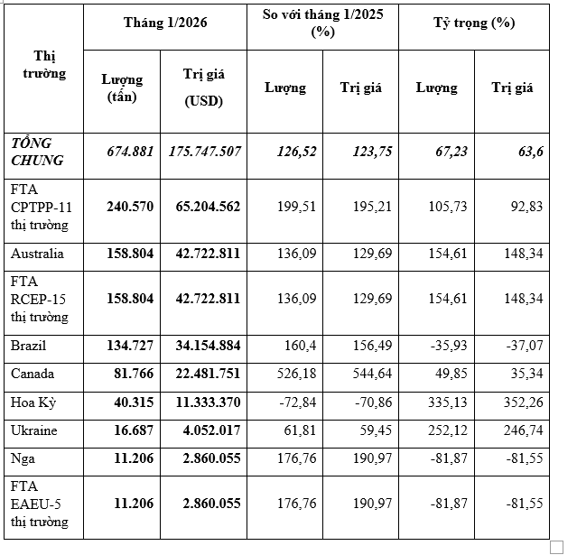 Lúa mì nhập khẩu về Việt Nam nhiều nhất từ thị trường Australia, tháng 1/2026 nhập khẩu 158.804 tấn, tương đương 42,72 triệu USD, giá trung bình 269 USD/tấn, tăng 136,09% về lượng, tăng 129,69% kim ngạch so với tháng 12/2025, nhưng giá giảm 2,71%; so với tháng 1/2025 cũng tăng 154,61% về lượng, tăng 148,34% về kim ngạch nhưng giảm 2,47% về giá; chiếm 23,53% trong tổng lượng và chiếm 24,31% trong tổng kim ngạch nhập khẩu lúa mì của cả nước.